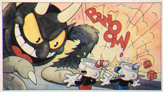 むかしむかし、インクウェル島とよばれる魔法の島に、 カップヘッドとマグマンという兄弟が住んでいました。 ふたりは物知りケトルじいさんのもとでのんびり暮らしていました。 ある日のこと。じいさんから何度も忠告されていたにも かかわらず、ふたりは家から遠く離れたガラの悪い地区にある 「デビルのカジノ」に入ってしまったのです。 カジノに入ると、カップヘッドとマグマンは あっという間にサイコロのテーブルで勝ちを重ねました。 「こりゃすごい!キミたちは負け知らずだね!」 カジノのいかがわしげな支配人、キングダイスが言いました。 「やるな、坊主ども」兄弟はハッと息をのみました。 なぜなら、この声の主はカジノのオーナー、デビルだったからです! 「そろそろ掛け金を上げてみるか?」 デビルは歯を見せ、ニヤリと笑って言いました。 「もう一度お前たちが勝てば、このカジノの金を全てくれてやろう!」 デビルが大きな声で言い放つと、あたりは沸き立ちました。 「ただし、負ければそのタマシイを頂く。さあ、取り引きするか?」 簡単に金持ちになれるチャンスに目がくらんだ カップヘッドはうなずきサイコロをつかみました。 「あっ、カップヘッド!いけない!」 危機を察したマグマンが叫びました。しかし、時すでに遅し! 「ピンゾロだ!」*サイコロの目の1が2個揃うこと デビルが床を叩きながら大笑いしました。 「貴様らの負けだ!」デビルが兄弟にせまり、 ふたりは恐怖で震え上がりました。 「さて、貴様らのタマシイだが…」 兄弟は命乞いをしました。 「き、きっと別の方法でお返ししますから」 マグマンは言葉につまりながらも訴えました。 「そ、そうです!おねがいします!」 カップヘッドも言いました。 「ふーむ、一考の余地はあるな」 デビルはニタニタと笑いながら1枚の羊皮紙を取り出しました。 「逃げ出した債務者どものリストがここにある。俺様の代わりに こいつらのタマシイを集めてこい。そうすれば貴様らのことは見逃してやってもいい」 「わかったらさっさと行け!」 デビルはうなり、ふたりをケリ飛ばして乱暴にカジノから追い出しました。 「こいつら全員のタマシイを明日の真夜中までに集めてこい! さもなくば、俺様が貴様らのタマシイを回収しにいく!」 カップヘッドとマグマンはすっかりおびえて全速力で逃げ出しました。 「はやく、マグ!」 カップヘッドは言いました。 「ケトルじいさんのところにいこう! きっとどうすればいいか教えてくれるから!」