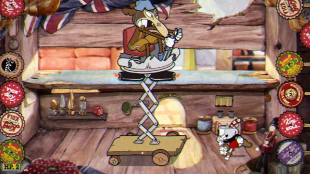 オススメショットはスプレッド、オトシダマ。 ステージを通して敵との距離が近くショットを当てやすいが、第1形態ではスプレッドが全弾当たるまで近づくとやや危険。適度な間隔を維持しよう。 お守りはピンクシュガーがオススメ。 第1形態時の突進攻撃のジャンプ台のパリィの判定がシビアだが、ピンクシュガーを使うことで楽に突進攻撃をかわすことが出来る。 また、カタパルトの発射するガムが隣り合っていることが多く、ゲージを貯めやすくなる。 更に第3形態時のネズミの霊体が発射する弾をパリィすることで、被弾する可能性を抑えることが出来る。
