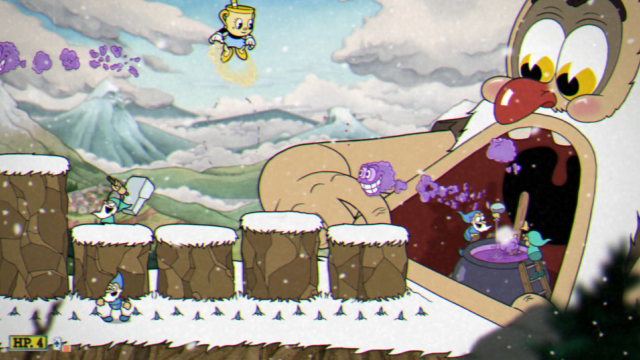 カップヘッド達に痛めつけられて怒り心頭のイワフマンは、足場になっていた岩石を壊してなんとそのまま飲み込んでう。 ここからは胃酸が満ちた彼の胃の中で戦うことになる。 ワニの骨型の足場を移動しながら、顔のついた腫れ物のような部分を攻撃していくことになる。