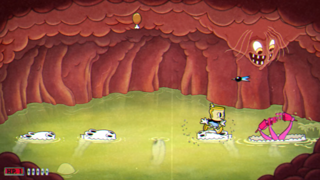 カップヘッド達に痛めつけられて怒り心頭のイワフマンは、足場になっていた岩石を壊してなんとそのまま飲み込んでしまう。