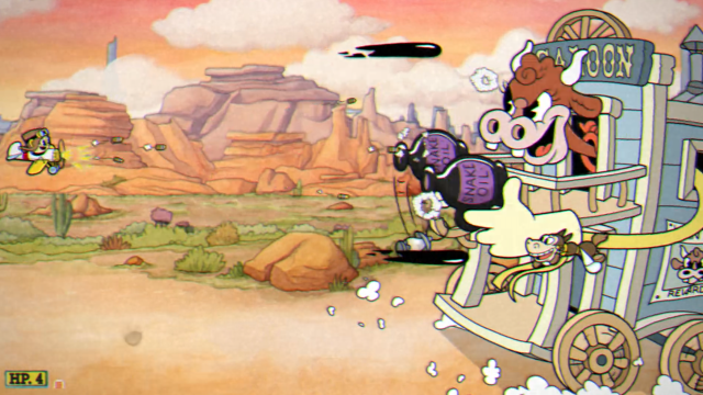 馬車とサルーン(酒場)が合体した2階建て装甲車から「ヒーハー!」と顔を出して登場。 食らい判定は頭にしかなく、定期的に頭を出す階を変えてくる。 第1形態とは思えない猛攻(モーこう)をしてくるが、攻撃の回避パターンを1つ1つ掴んで慣れていこう。これは長い決闘の序章に過ぎないのだから…。