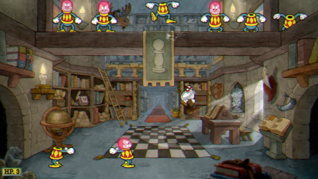 ギロチンの女の子にお熱なご様子の処刑執行人の大男。彼の斧に掛かれば、どんな罪人の首も軽ーく飛んでいく。 元々ルークは戦車を表す。 これまでと違い、ただパリィすればいいわけではなく、ルークが飛ばしてくる罪人の生首をパリィで打ち返して命中させる必要がある。 生首をルークに命中させるには2回ほどパリィでの打ち上げが必要。幸い生首たちも乗り気なようなので、攻撃に気を付けつつガンガンパリィしていこう。 どうやらルークに命中した位置によってダメージ量が変わるようだ。 頭に当てると2ポイントダメージを与え、それ以外の場所は1ポイントの判定になる。そしてルークは18ポイント当てると倒せるので、最短9回当てるだけで倒せる。積極的に頭を狙おう。