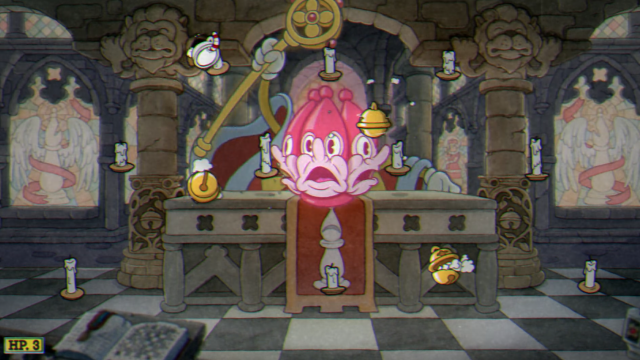 3つの顔を持つ司教が相手。頭を9回パリィすればクリア。 頭がピンク色になっているときはパリィ可能だが、一度パリィをすると蝋燭の火が灯り、全て消すまで無敵になる。まずは火を全て消してやろう(蝋燭と自機が重なれば火が消える。)。 後半になるほど消さなければならない蝋燭の火の数が増える。消すのに夢中になって被弾することは避けよう。 画面両端が頭が接近しない上に、オブジェクトが少なく視認しやすいので、迷ったらここに逃げ込んでもいいかもしれない。 加護のない司教など風前の灯火だ。 普通に考えて頭3つとか恐怖である。